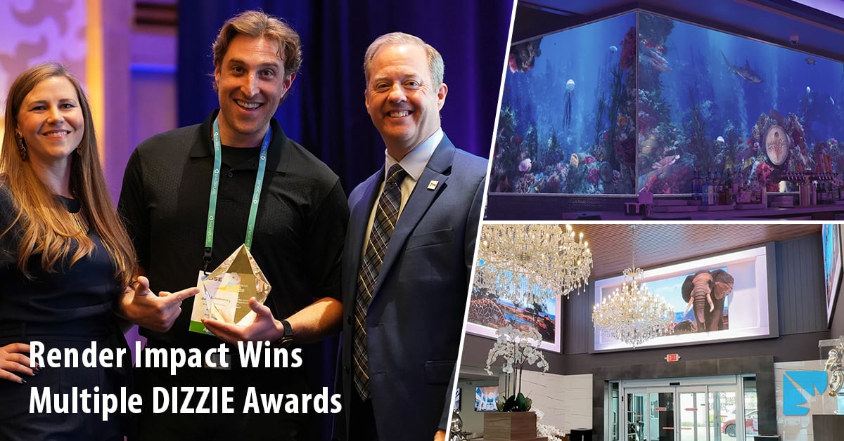 Render Impact recently attended the Digital Signage Experience 2025 in San Diego, California. During the event, our team was honored to receive two DIZZIE Awards recognizing our work in the Hospitality and Restaurants, Bars, and Foodservice categories. In addition, a third DIZZIE was won in the Transportation category by Clear Channel Outdoor – Airports Division for our collaboration on the Moment Tower Digital Experience at SFO.